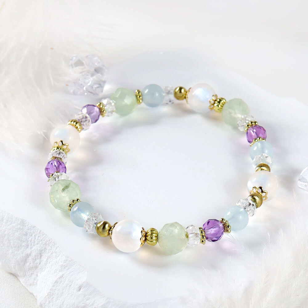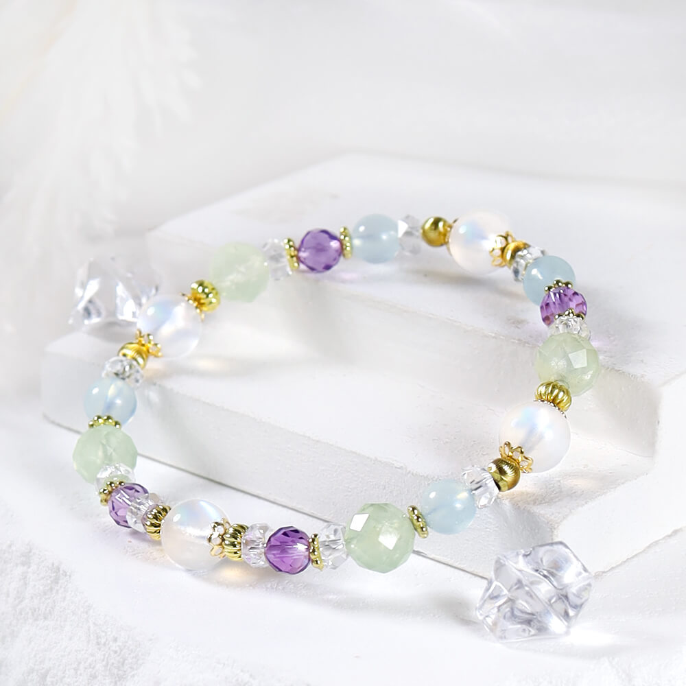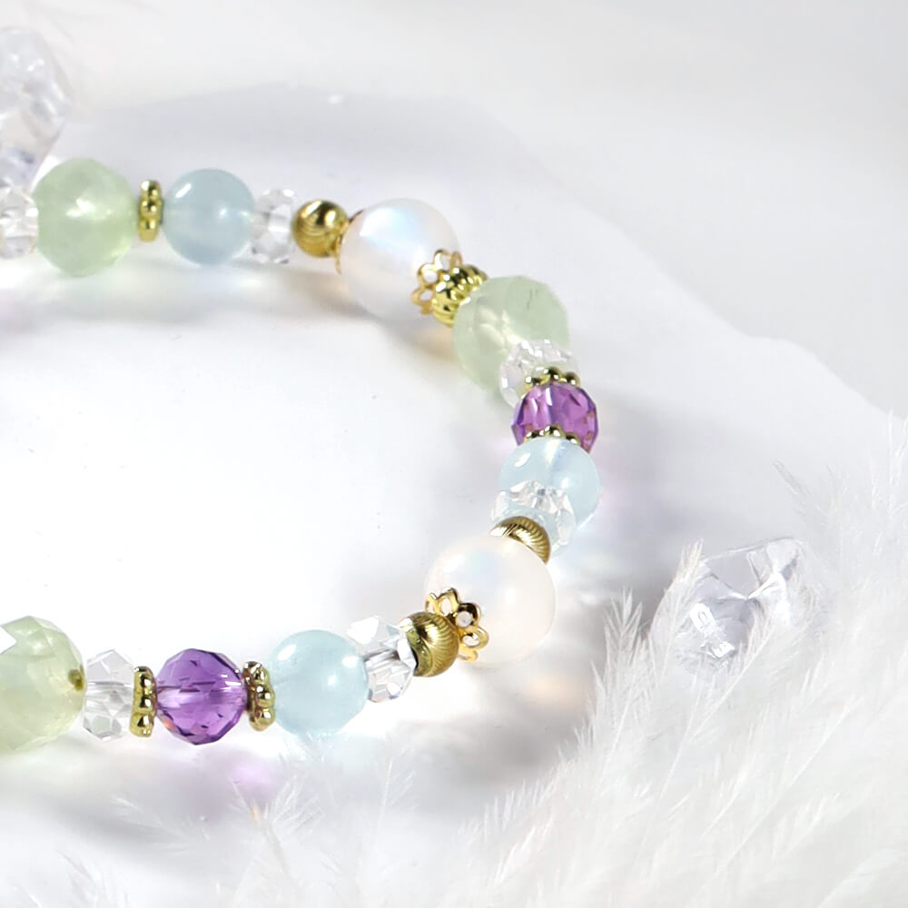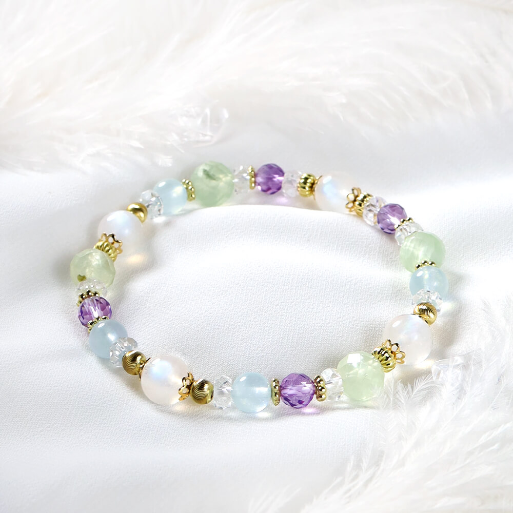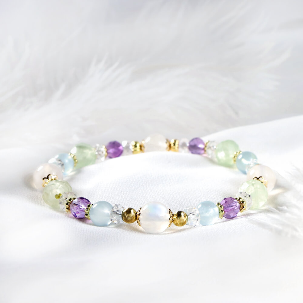 月光石、葡萄石、紫水晶、海藍寶、白水晶