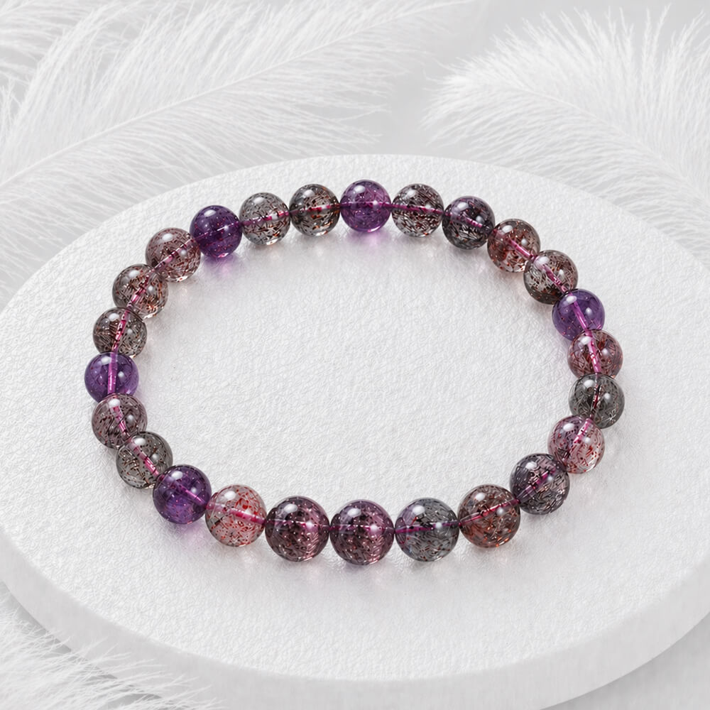 精選超七的特色在於共生礦含量多,許多料子為滿礦狀態,七種礦物在晶體中大量聚集,能量感強勁飽滿。相較於頂級超七追求晶體通透,精選超七的色調飽和度較低,但礦物分布密實、能量紮實,是許多重視能量感受的人偏好的款式。